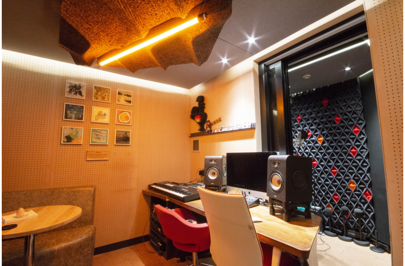 The VO Booth is compact but sufficient for a single artist with the rear wall using a custom acoustic treatment system developed especially for this unique project.